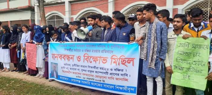 নিজস্ব প্রতিবেদক: নেত্রকোণার মোহনগঞ্জ সরকারি কলেজে অধ্যক্ষ প্রফেসর আবুল হোসেন চৌধুরীর নানা অনিয়ম-দুর্নীতির প্রতিবাদে বিক্ষোভ করেছে শিক্ষার্থীরা।