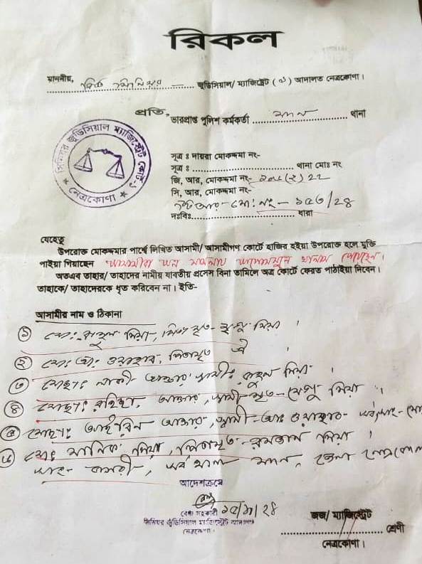 নেত্রকোনা সিনিয়র জুডিসিয়াল ম্যাজিস্ট্রেট (১) আদালতের কার্যালয় হতে এসব তথ্য নিশ্চিত হওয়া গেছে।