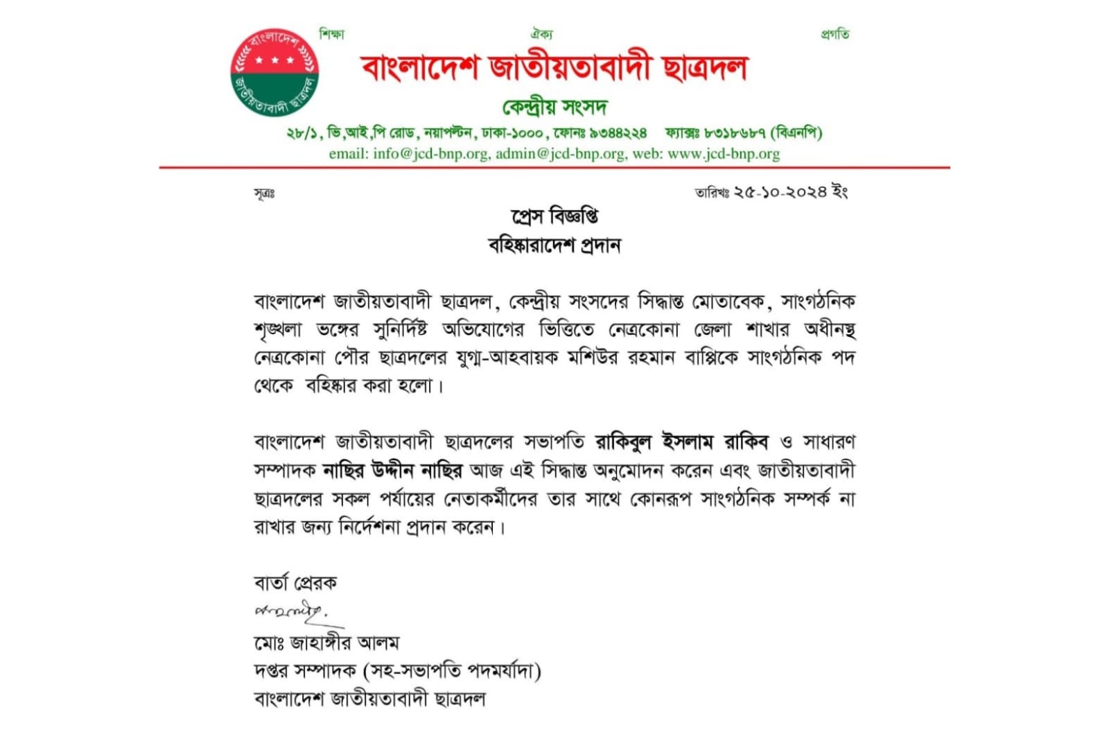 প্রেস বিজ্ঞপ্তি থেকে জানা যায়, সাংগঠনিক শৃঙ্খলা ভঙ্গের সুনির্দিষ্ট অভিযোগের ভিত্তিতে নেত্রকোনা জেলা শাখার অধীনস্থ নেত্রকোনা পৌর ছাত্রদলের যুগ্ম-আহবায়ক মশিউর রহমান বাপ্পিকে সাংগঠনিক পদ থেকে বহিস্কার করা হলো। সেই সাথে জাতীয়বাদী ছাত্রদলের সকল পর্যায়ের নেতাকর্মীদের তার (বাপ্পি) সাথে কোনরূপ সাংগঠনিক সম্পর্ক না রাখা জন্য নির্দেশও প্রদান করা হয়েছে।