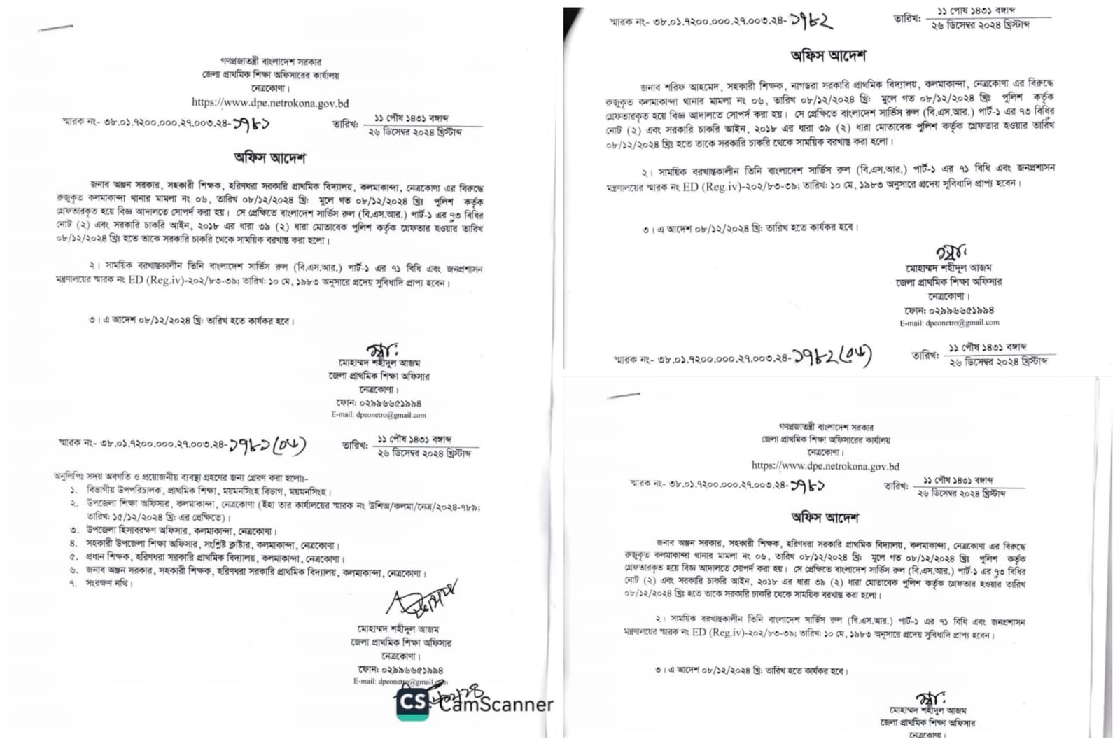 রবিবার (৫ ডিসেম্বর) এতথ্য জানান নেত্রকোনা জেলা প্রাথমিক শিক্ষা কর্মকর্তা মোহাম্মদ শহীদুল আজম এবং তার গত ২৬ ডিসেম্বর তারিখে স্বাক্ষরিত পৃথক দুটি পত্র হতে দুজন শিক্ষক বরখাস্তের সত্যতা নিশ্চিত হওয়া গেছে।