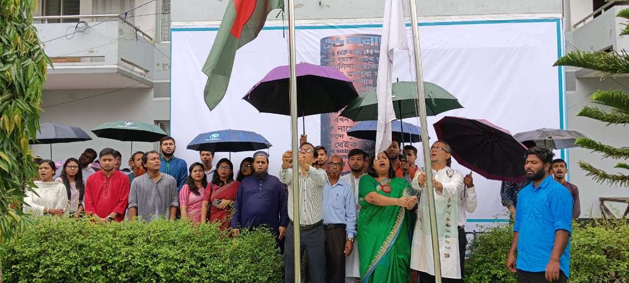 মঙ্গলবার (৫ আগস্ট) সনকাল ৮টায় বিশ্ববিদ্যালয়ের অস্থায়ী ক্যাম্পাস প্রাঙ্গণে জাতীয় পতাকা উত্তোলনের মধ্য দিয়ে শুরু হয় আনুষ্ঠানিকতা। জাতীয় সংগীত পরিবেশনের সঙ্গে সঙ্গে উত্তোলিত হয় গৌরবময় পতাকা। জাতীয় পতাকা উত্তোলন করেন মাননীয় ভাইস-চ্যান্সেলর অধ্যাপক ড. খন্দকার মোহাম্মদ আশরাফুল মুনিম ও ট্রেজারার অধ্যাপক ড. আনিছা পারভীন। উপস্থিত ছিলেন রেজিস্ট্রার ড. মোহাম্মদ হারুন-অর-রশিদ, বিভিন্ন বিভাগের শিক্ষক, কর্মকর্তা, কর্মচারী ও শিক্ষার্থীবৃন্দ।