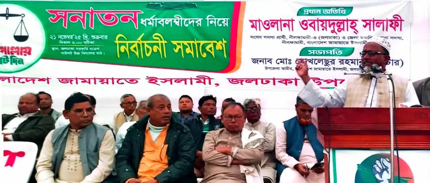 নীলফামারীর জলঢাকায় সনাতন ধর্মাবলম্বীদের অংশগ্রহণে একটি নির্বাচনী সমাবেশ অনুষ্ঠিত হয়েছে। আসন্ন জাতীয় সংসদ নির্বাচনকে সামনে রেখে এলাকার রাজনৈতিক পরিবেশে যে আগ্রহ তৈরি হয়েছে, এই সমাবেশ সেই আলোচনাকে আরও বাড়িয়েছে। গত (২১ নভেম্বর) বিকেলে উপজেলা সরকারি মডেল পাইলট উচ্চ বিদ্যালয় মাঠে বাংলাদেশ জামায়াতে ইসলামী উপজেলা শাখার উদ্যোগে সমাবেশের আয়োজন করা হয়।