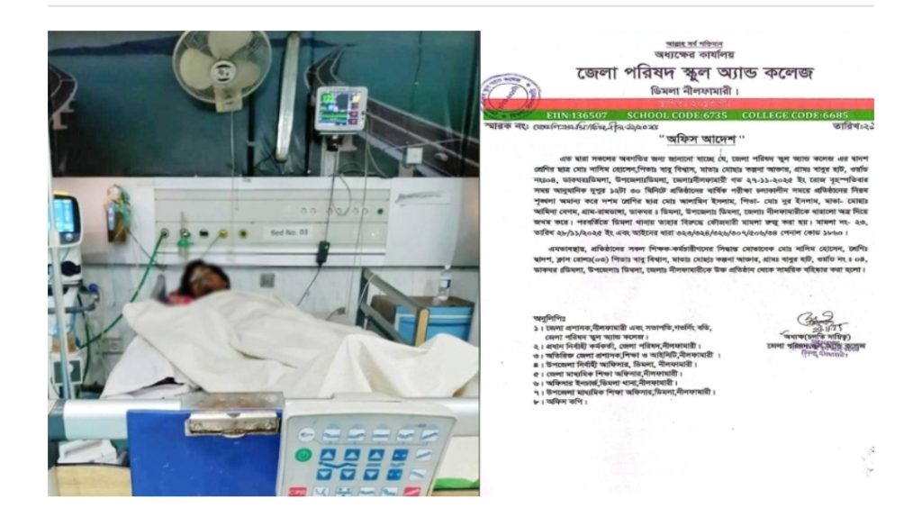 নীলফামারীর ডিমলা উপজেলার জেলা পরিষদ স্কুল অ্যান্ড কলেজে তুচ্ছ এক বেঞ্চ বিষয়কে কেন্দ্র করে ঘটে যাওয়া ছুরিকাঘাতের ঘটনায় শিক্ষার্থী নাসিম হোসেনের বিরুদ্ধে কঠোর প্রশাসনিক ব্যবস্থা নিয়েছে কলেজ কর্তৃপক্ষ। গুরুতর আহত শিক্ষার্থী আল আমিন রংপুর মেডিকেল কলেজ হাসপাতালের আইসিইউতে মৃত্যুপথযাত্রী অবস্থায় চিকিৎসাধীন।
