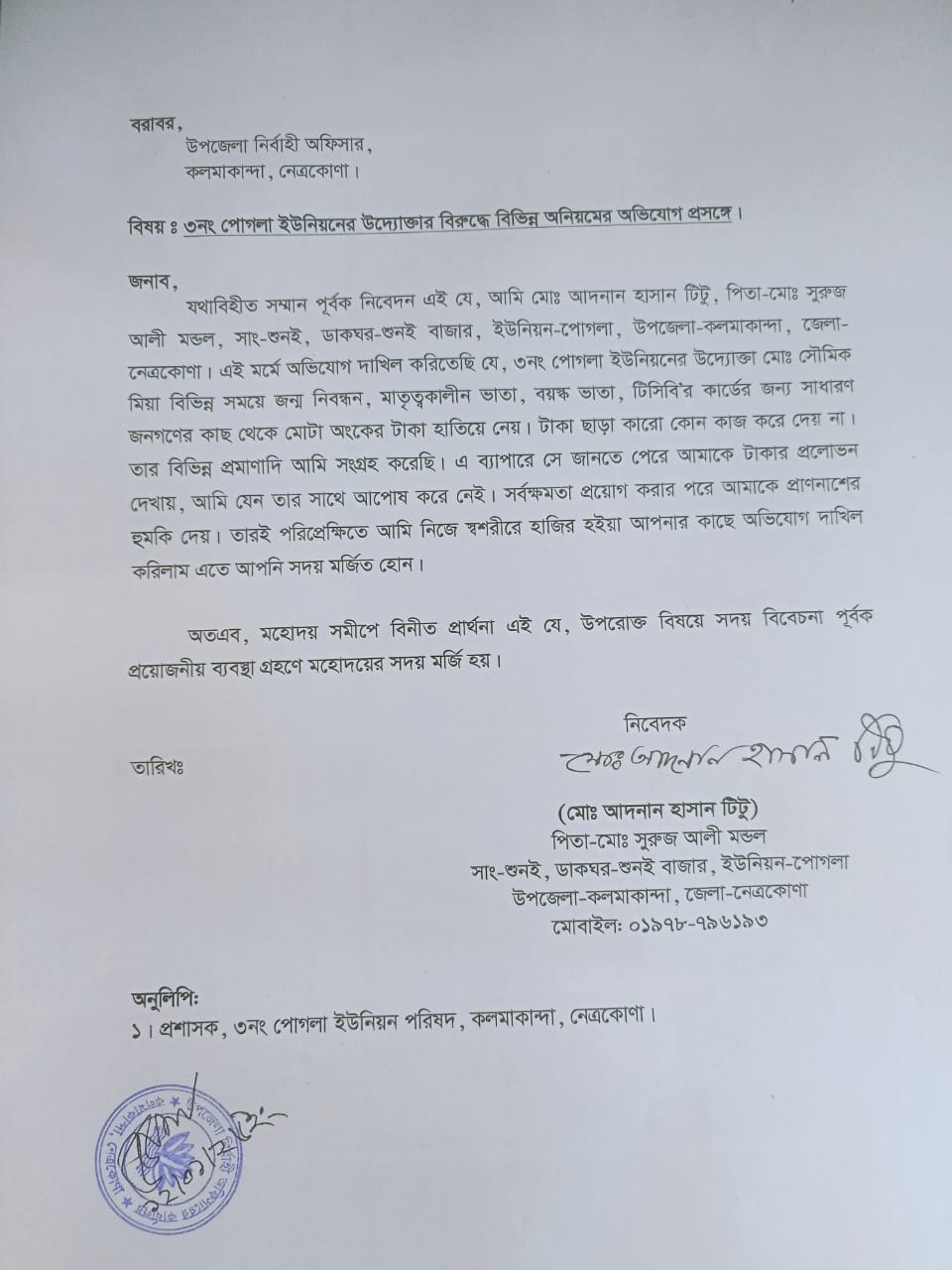 এ সংক্রান্ত একটি লিখিত অভিযোগ উপজেলা নির্বাহী অফিসার বরাবর দাখিল করেছেন, পোগলা ইউনিয়নের শুনই গ্রামের বাসিন্দা মো. সুরুজ আলী মন্ডলের ছেলে মো. আদনান হাসান টিটু।