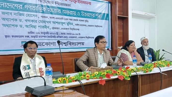 নিজস্ব প্রতিবেদক: নেত্রকোনা বিশ্ববিদ্যালয় কর্তৃক আয়োজিত নিয়মিত একাডেমিক উদ্যোগ ‘নেত্রকোনা বিশ্ববিদ্যালয় বক্তৃতামালা’ শীর্ষক অনুষ্ঠানের পঞ্চম পর্ব সোমবার সকাল ১১টায় বিশ্ববিদ্যালয়ের অস্থায়ী ক্যাম্পাসের কনফারেন্স কক্ষে অনুষ্ঠিত হয়।