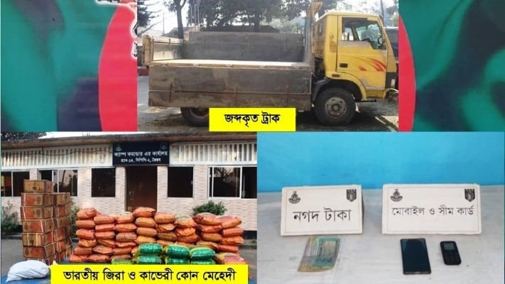 তবে এসময় কৌশলে অন্য এক সহযোগী পালিয়ে যেতে সক্ষম হয়। পরবর্তীতে ট্রাকে তল্লাশি চালিয়ে বিশেষ কৌশলে লুকিয়ে রাখা ৬০ বস্তায় মোট ১৮০০ কেজি জিরা এবং ১৯টি কার্টুনে ১৪ হাজার ৩৮৮ পিস মেহেদী উদ্ধার করা হয়।