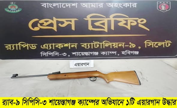ঝোপঝাড় ও বনজঙ্গল থেকে অস্ত্র উদ্ধারের পর এবার কালভার্টের পাশ থেকে একটি এয়ারগান উদ্ধার করেছে র্যাব। র্যাব-৯ সিপিসি-৩ শায়েস্তাগঞ্জ ক্যাম্পের একটি দল হবিগঞ্জে অভিযান চালিয়ে এয়ারগানটি উদ্ধার করে। রোববার (২৫ জানুয়ারি) ভোর আনুমানিক ৫টার দিকে হবিগঞ্জ সদর মডেল থানাধীন আমতলী এলাকার একটি কালভার্টের পাশ থেকে এয়ারগানটি উদ্ধার করা হয়।