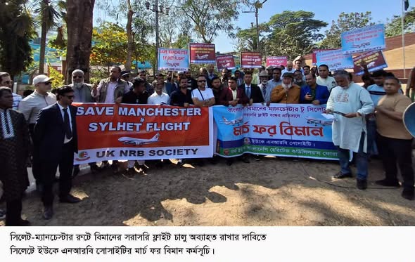 সুরতাং এই রুট বন্ধ করলে বৃটেনের একাংশের মানুষ যাতায়াতে অসুবিধা পড়বেন। সমাবেশে বক্তব্য রাখেন- ইউএকে এনআরবি সোসাইটি’র ডিরেক্টর এম আহমদ জুনেদ, ডিরেক্টর ও ওল্ডহাম বিএনপি’র প্রতিষ্টাতা সভাপতি জামাল উদ্দিন, সোসাইটির ডিরেক্টর ইসমাইল হোসেন ও মোতালিব চৌধুরী, যুক্তরাজ্যের কমিউনিটি নেতা বুলবুল আমিন, বদরুল আলম, দবির মল্লিক, জামান মিয়া, রাসেল চৌধুরী, নুরুল আমিন, মাসুকউদ্দিন, শাহাবউদ্দিন, ড্যানি, আব্দুস শহীদ প্রমুখ। সমাবেশ শেষে ইউকে এনআরবি সোসাইটির নেতৃবৃন্দ বিমান সিলেট অফিসের ম্যানেজারের কাছে স্মারকলিপি পেশ করেন।