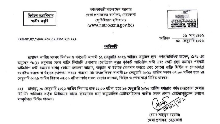 নিজস্ব প্রতিবেদক: আগামী ১২ ফেব্রুয়ারি অনুষ্ঠিতব্য ত্রয়োদশ জাতীয় সংসদ নির্বাচন ও গণভোটকে কেন্দ্র করে নেত্রকোনা জেলায় সকল প্রকার জনসভা, মিছিল এবং মোটরসাইকেল চলাচলের ওপর কঠোর নিষেধাজ্ঞা জারি করেছে জেলা প্রশাসন।
