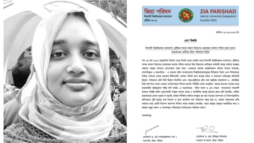 ইসলামী বিশ্ববিদ্যালয়ের (ইবি) সমাজকল্যাণ বিভাগের সভাপতি সহকারী অধ্যাপক আসমা সাদিয়া রুনা হত্যার বিচার চেয়ে বিবৃতি দিয়েছেন বিশ্ববিদ্যালয়ের বিএনপিপন্থী শিক্ষকদের সংগঠন জিয়া পরিষদ।