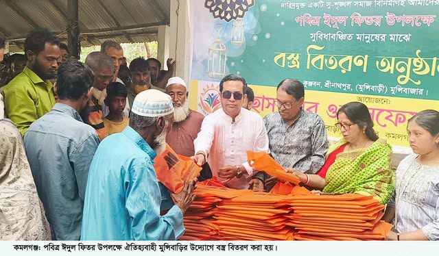 পবিত্র ঈদুল ফিতর উপলক্ষে মৌলভীবাজারের কমলগঞ্জ উপজেলার ১নং রহিমপুর ইউনিয়নের শ্রীনাথপুর গ্রামের ঐতিহ্যবাহী মুন্সিবাড়ির উদ্যোগে বুধবার (১৮ মার্চ) দুপুরে সুবিধাবঞ্চিত ৩ শতাধিক মুসলিম নারী-পুরুষের মাঝে শাড়ী-লুঙ্গি বিতরণ করা হয়।