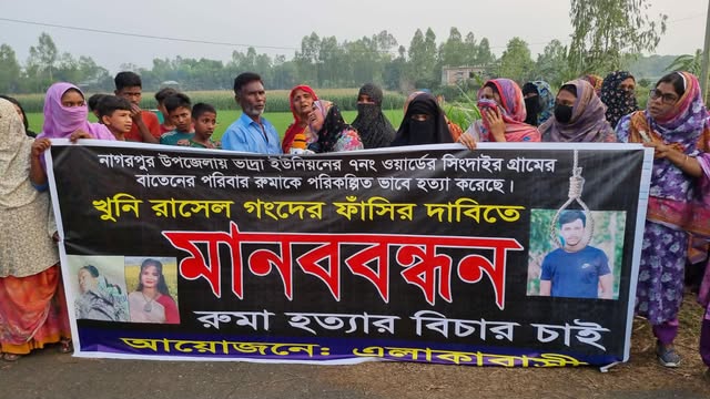 টাঙ্গাইলের নাগরপুর উপজেলার ভাদ্রা ইউনিয়নের কোদালিয়া গ্রামের শতশত নারী পুরুষ রুমা’র হত্যাকারী রাসেলের ফাঁশির দাবিতে মানববন্ধন করেছে। গতকাল গৃহবধূ রুমা’র রহস্যজনক মৃত্যু কে হত্যা দাবি করে, হত্যাকারীদের বিচারের দাবিতে আজ ২৯ মার্চ রবিবার সন্ধ্যায় উপজেলার ভাদ্রা ইউনিয়নের কোদালিয়া গ্রামের নানা শ্রেণি-পেশার ভিন্ন বয়সী শতশত নারী-পুরুষ ও শিশুরা বিক্ষোভ মিছিল ও মানববন্ধন করেছে।