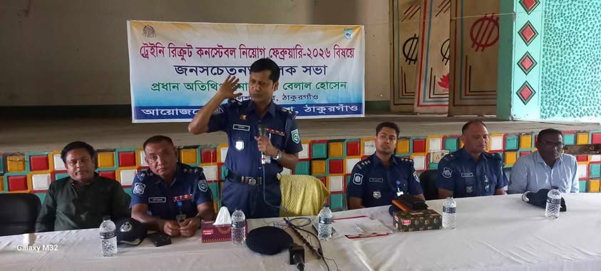 ঠাকুরগাঁওয়ের পীরগঞ্জে ট্রেইনি রিক্রুট কনস্টেবল (টিআরসি) নিয়োগ উপলক্ষে জনসচেতনতামূলক সভা অনুষ্ঠিত হয়েছে। সোমবার (৩০ মার্চ) দুপুরে পীরগঞ্জ পৌর অডিটোরিয়ামে এ সভা আয়োজন করা হয়। সভায় প্রধান অতিথি বক্তব্যে ঠাকুরগাঁওয়ের পুলিশ সুপার বেলাল হোসেন বলেন, আসন্ন পুলিশ কনস্টেবল নিয়োগ সম্পূর্ণ নিয়ম মেনে, স্বচ্ছ ও নিরপেক্ষভাবে অনুষ্ঠিত হবে। তিনি সকলকে প্রতারণার ফাঁদে পা না দেওয়ার আহ্বান জানান।
