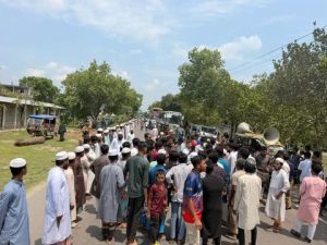 ময়মনসিংহের ঈশ্বরগঞ্জে স্পীড ব্রেকার নির্মাণের দাবিতে গাছের গুঁড়ি ফেলে ময়মনসিংহ-কিশোরগঞ্জ মহাসড়ক অবরোধ করেছেন উপজেলার মাইজবাগ ইউনিয়নের স্থানীয় বাসিন্দারা। এ সময় তাঁরা মানববন্ধন ও বিক্ষোভ করেন। এতে ময়মনসিংহ-কিশোরগঞ্জ মহাসড়কের দুই পাশে দীর্ঘ যানজটের সৃষ্টি হয়। এসময় বিক্ষোভকারীরা ১ ঘণ্ট মহাসড়ক অবরোধ করে রাখেন। খবর পেয়ে ঈশ্বরগঞ্জ থানার ওসি বিক্ষোভকারীদের স্পীড ব্রেকার স্থাপনের আশ্বাস দিয়ে সড়কে যান চলাাচল স্বাভাবিক করেন।