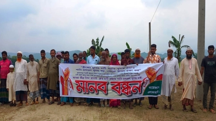 মানববন্ধনে বক্তব্য দেন, স্থানীয় বাসিন্দা আব্দুল মোতালিব, সাবেক ইউপি সদস্য আবদুর রহিম, মোমেনা খাতুন, জনি মিয়া, মো. আখতারুজ্জামান প্রমুখ। বক্তারা ক্ষোভ প্রকাশ করে বলেন, “কিছু প্রভাবশালী ব্যক্তির খামখেয়ালিপনার কারণে আজ পুরো এলাকার কৃষক পথে বসার উপক্রম হয়েছে। অবিলম্বে ভরাটকৃত মাটি অপসারণ করে পানি প্রবাহ স্বাভাবিক করতে হবে।”