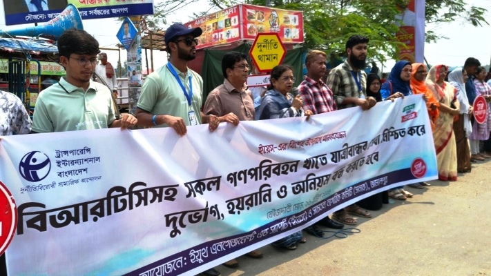 জামালপুর প্রতিনিধি: জামালপুরে গণপরিবহনে যাত্রীদের নিত্যদিনের হয়রানি ও চরম অনিয়ম বন্ধ করে নিরাপদ ও যাত্রীবান্ধব সেবা নিশ্চিত করার দাবিতে মানববন্ধন অনুষ্ঠিত হয়েছে। বৃহস্পতিবার (১৬ এপ্রিল) দুপুরে শহরের ফৌজদারি মোড়ে সচেতন নাগরিক কমিটি (সনাক) ও ইয়ুথ এনগেজমেন্ট এন্ড সাপোর্ট (ইয়েস) এর যৌথ উদ্যোগে এ কর্মসূচির আয়োজন করা হয়।