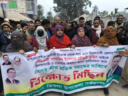 রুহুল আমিন,ডিমলা(নীলফামারী) নীলফামারী-১ (ডোমার-ডিমলা) আসনে বিএনপির দলীয় প্রতীক ধানের শীষ প্রকৌশলী শাহরিন ইসলাম চৌধুরী তুহিনের নামে বরাদ্দ দেওয়ার দাবিতে ডিমলা উপজেলায় বিক্ষোভ মিছিল অনুষ্ঠিত…
