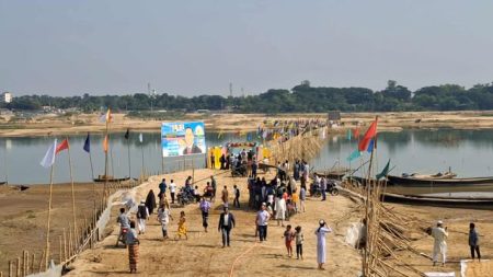 দুর্গাপুর (নেত্রকোনা) প্রতিনিধি- নেত্রকোনার দুর্গাপুরে সোমেশ্বরী নদীর বুকে নির্মিত হয়েছে প্রায় ৮০০ মিটার দীর্ঘ বাঁশ-কাঠের অস্থায়ী একটি সেতু। সেতুটি চালু হওয়ায় স্থানীয় বাসিন্দা, ব্যবসায়ী…