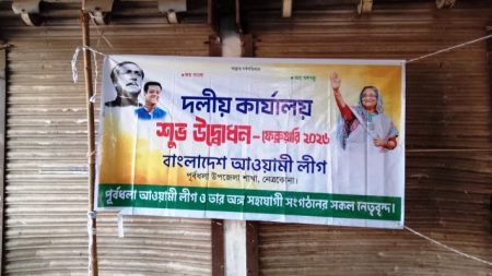 নিজস্ব প্রতিবেদক: নেত্রকোনা জেলার পূর্বধলা উপজেলায় দীর্ঘদিন ধরে বন্ধ থাকা বাংলাদেশ আওয়ামী লীগের দলীয় কার্যালয়ের সামনে হঠাৎ করে একটি উদ্বোধনী ব্যানার টানানোকে কেন্দ্র করে…